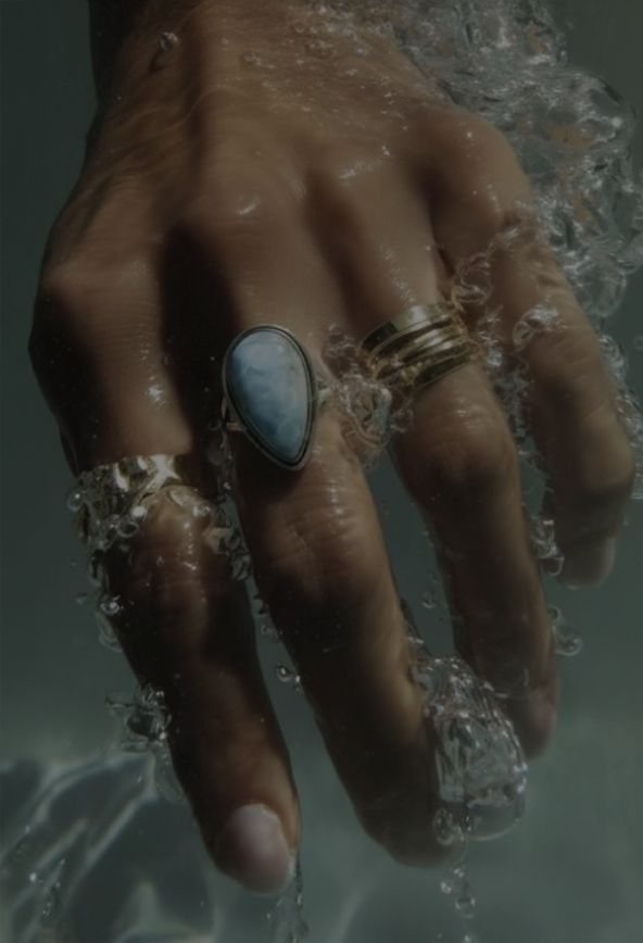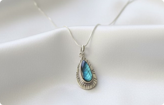 שרשרת כסף 925 עם תליון טיפה יוקרתי, המשובץ באבן פנינה מנצנצת בגווני ים עמוקים. בעלת עיצוב ייחודי: גימור גלי המדגיש את יופיה המסתורי של האבן ומעניק מראה אלגנטי ועל-זמני.