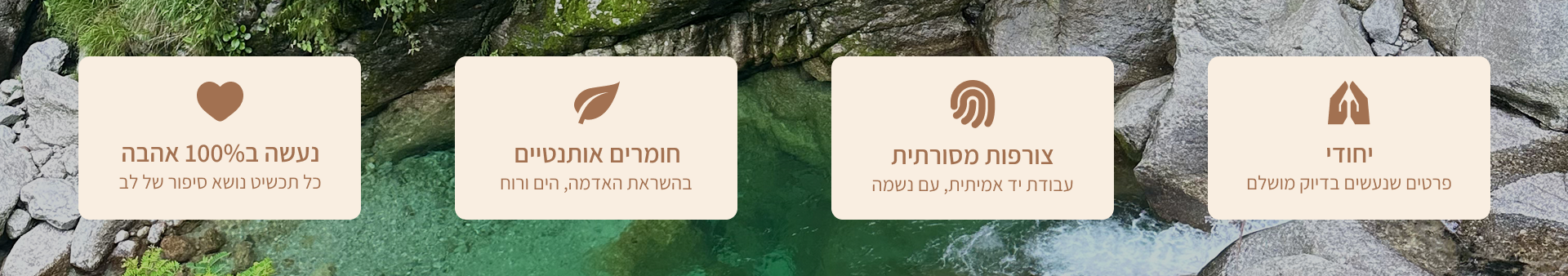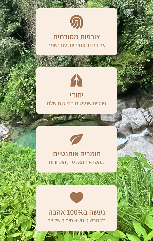 האם אי פעם חלמתם על תכשיט אחד ויחיד? כזה שמספר את הסיפור שלכם, נושא משמעות עמוקה, והוא מדויק עד הפרט האחרון? אצלנו ב Ben's, החלום שלכם הופך למציאות. אנחנו מאמינים שזיכרונות יקרים ראויים למסגרת שתחזיק מעמד לנצח. לכן, אנו משתמשים אך ורק בחומרי גלם איכותיים ביותר- ציפוי זהב 14k, כסף 925 ונחושת וכמובן חריטות מיוחדות במינן ואבני חן נדירות. הכל כדי ליצור עבורכם יצירת מופת שאינה מתפשרת על יופי ועמידות.